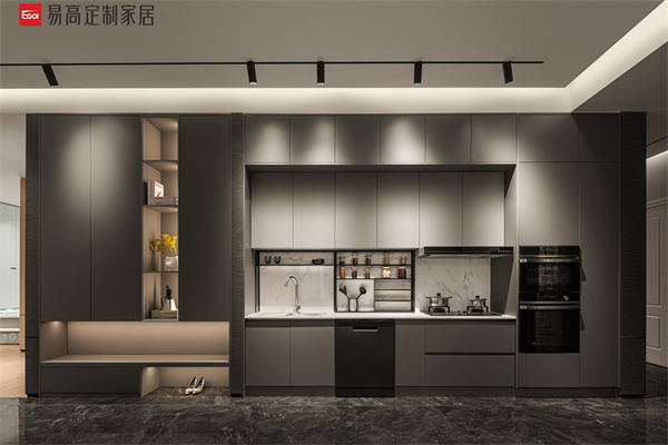 客餐厨一体化设计,开放式布局消融彼此界限,加强空间之间的功能与美学联系,促进社交互动。全系爱格板和先进的激光封边工艺,在深沉色系的包裹下,呈现出天生不凡的高端生活质感。亮色软装在视觉中跳脱出来,令空间张力十足。